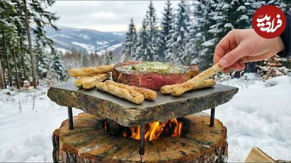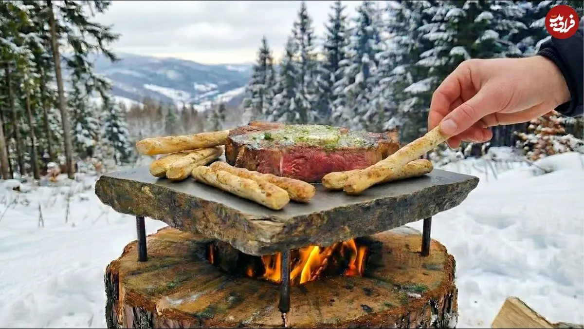 ببینید| غذای روستایی در لهستان؛ پخت استیک و تخم مرغ روی سنگ داغ در کوه های برفی