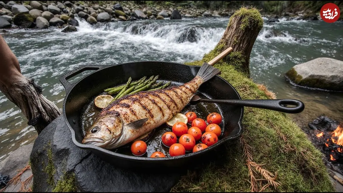 در این ویدئو یک طبیعت گرد آمریکایی را خواهید دید که یک ماهی را به همراه سبزیجات ودر کنار رودخانه کباب می کند.