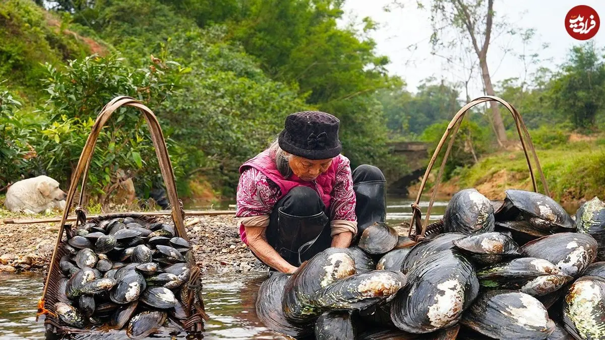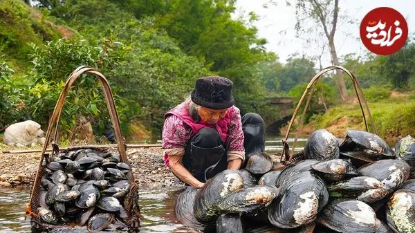 ببینید| غذای روستایی در چین؛ برداشت صدف آب شیرین و پخت غذا با آن
