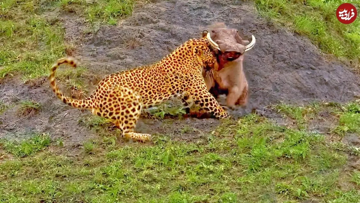 در این ویدئو یک قلاده پلنگ را می بینید که قصد شکار یک گراز بزرگ را دارد. اما با مقاومت شدید این حیوان روبهرو می شود و درگیری آنها تا ورودی لانه گراز ادامه پیدا می کند. این صحنه ها در پارک ملی کروگر در آفریقای جنوبی ضبط شده است.
