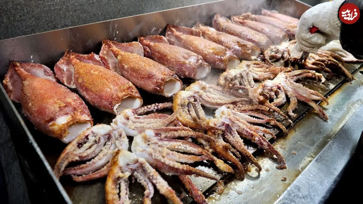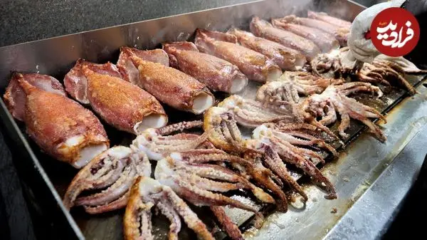 ببینید| غذای خیابانی در کره؛ کباب انواع ماهی، مارماهی و ماهی مرکب در سئول