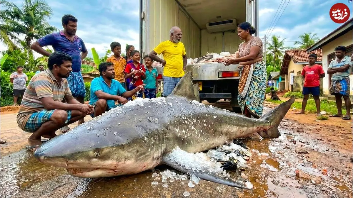 ببینید| فرآیند صید کوسه گاوی 250 کیلوگرمی و برش زدن آن در سریلانکا