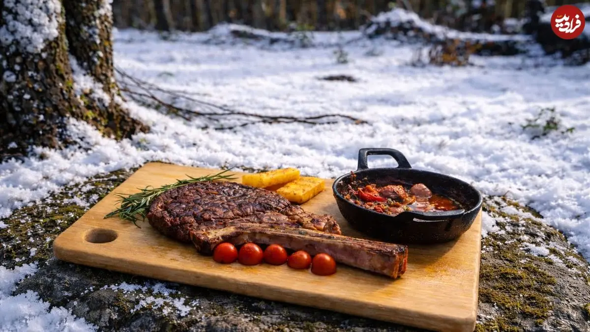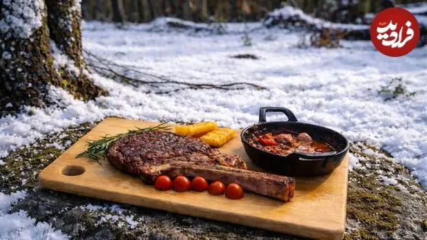 ببینید| غذای روستایی در آمریکا؛ پخت استیک روی آتش و در هوای برفی جنگل