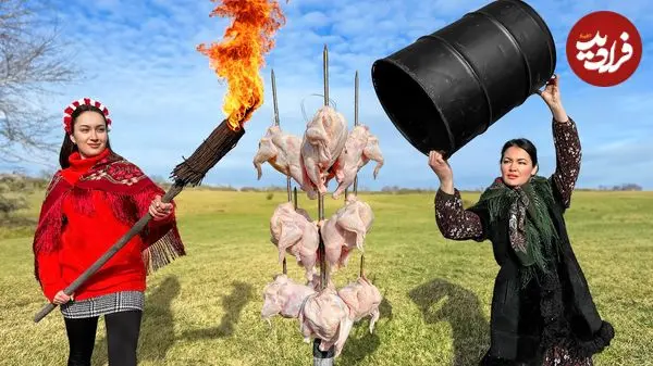 ببینید| غذای روستایی در اوکراین؛ کباب مرغ کامل در بشکه