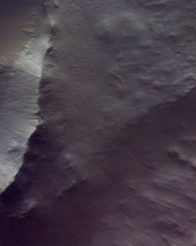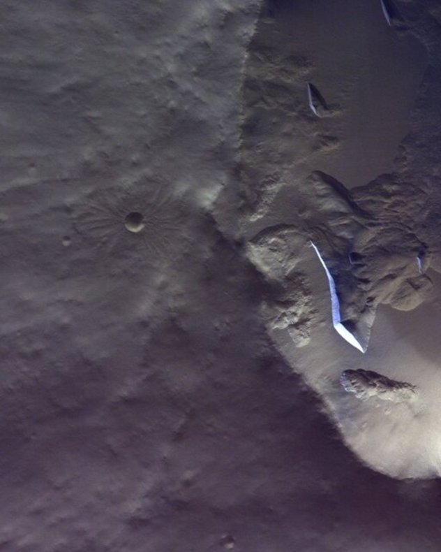 آژانس فضایی اروپا در ادامه نوشت: به رغم نور کم این تصویر، اما چندین شکاف یخی رو به شمال، به دلیل پوشش یخبندان دی اکسید کربن سفید درخشان به طور واضحی قابل مشاهده هستند.