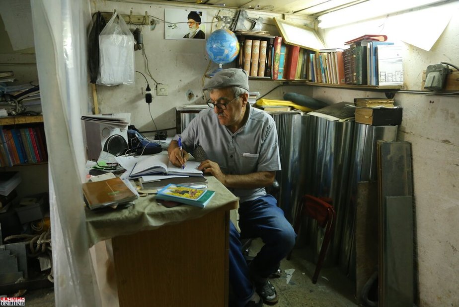 در انتهای مغازه کانالسازی، جای دنجی وجود دارد که حیدری در طول روز، چند مرتبه برای رفع خستگی و به قول خودش نفس چاق کردن، در آنجا با قلم و کاغذهایش خلوت میکند، خلوتی صمیمانه و آرام.