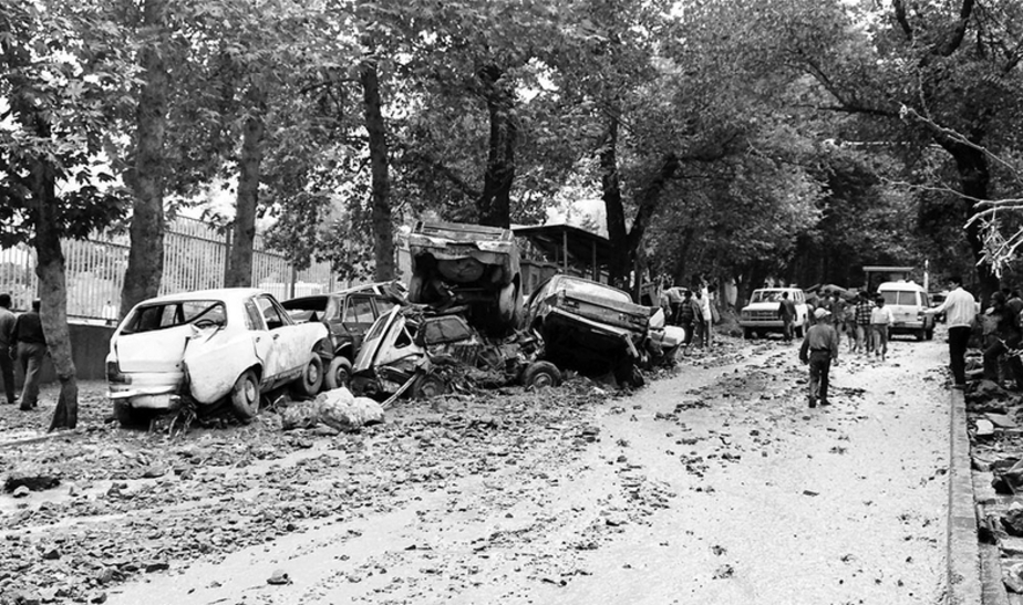 صدها اتومبیل بیآنکه از سرنشینان آنها خبری باشد، در گل و لای خیابانهای تجریش، شریعتی و حتی تا حوالی پل رومی گیر کرده بودند. همه جا پر از سنگهای ریز و درشت شده بود. اینجا و آنجا تپههایی از گل و لای، اتومبیلهای درهم شکسته و تنه درخت دیده میشد و البته انبوه جنازههایی که در گل و لایها و به تنه درختان درهم شکسته گیر کرده بودند.»