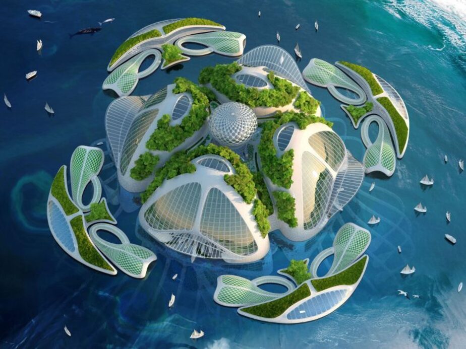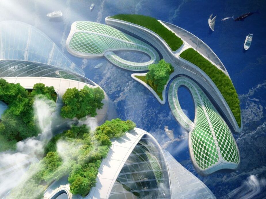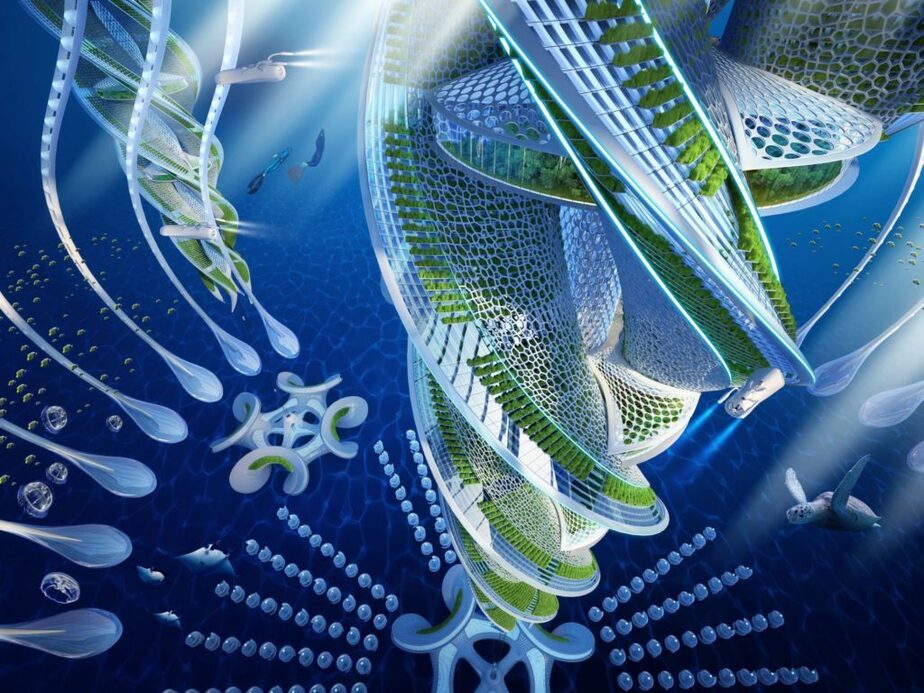 ایکوریا (Aequorea)، یک شهر آبی خیالی در سواحل ریودوژانیرو برزیل است که به گونهای طراحی شده که ساختمانهای عظیم اقیانوسی آن که تماما از زبالههای پلاستیکی چاپ سه بعدی ساخته شده، ۱۰۰۰ متر زیر آب بهطور مارپیچ در حرکت هستند؛ یک دهکده زیست زمحیطی خودکفا و غیرآلاینده به شکل چتر دریایی که تقریبا همه چیز آن زیر سطح دریا قرار دارد.