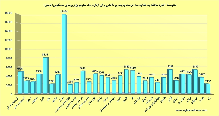 با توجه به گزارش مرکز آمار، از وضعیت مسکن کل کشور در نیمه اول سال 1394، مشاهده میشود که متوسط مبلغ اجاره ماهانه به علاوه سه درصد ودیعه پرداختی برای اجاره یک مترمربع زیربنای مسکونی در کل کشور معادل هفت هزار و 465 تومان است که این مبلغ در استان تهران معادل 17 هزار و 804 تومان و در استان چهارمحال و بختیاری معادل دو هزار و 39 تومان است که به ترتیب بیشترین و کمترین به شمار میرود.