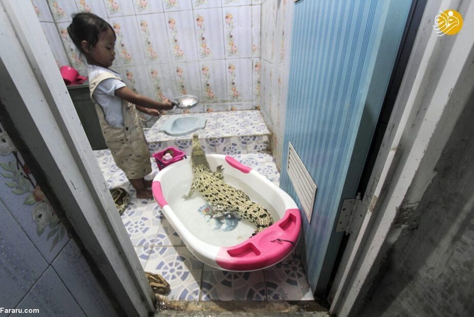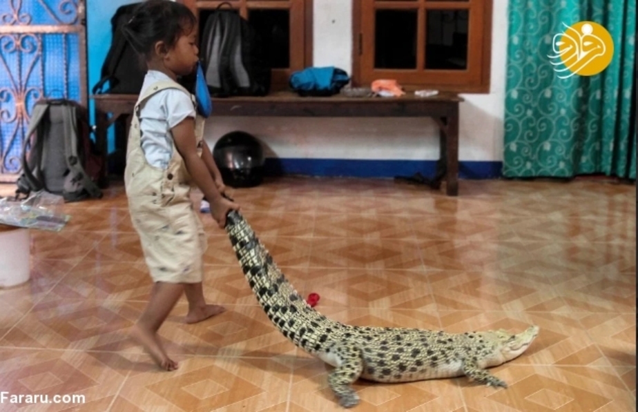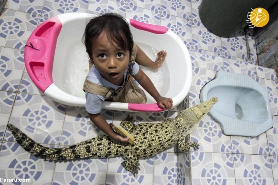 این دختر درست مثل دخترانی که با عروسکهای خود بازی میکنند با این تمساح رفتار میکند. تمساح را به حمام میبرد و حتی دوست دارد در کنارش بخوابد!