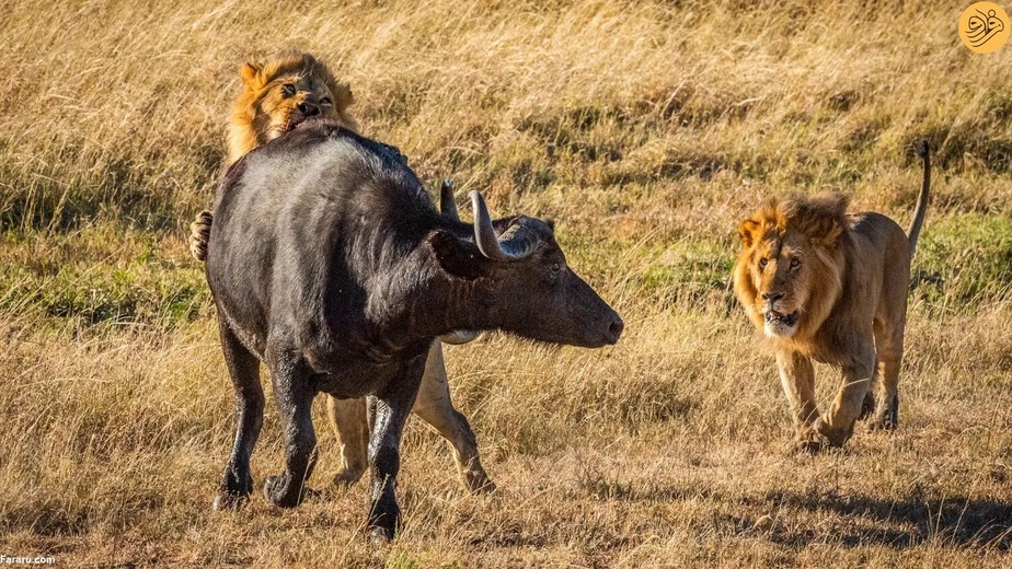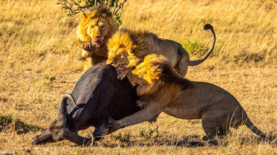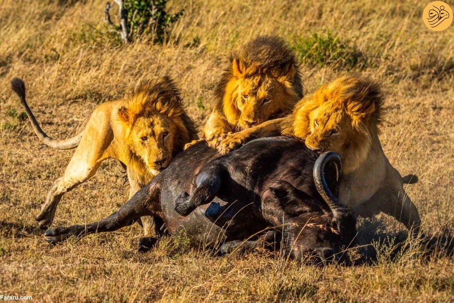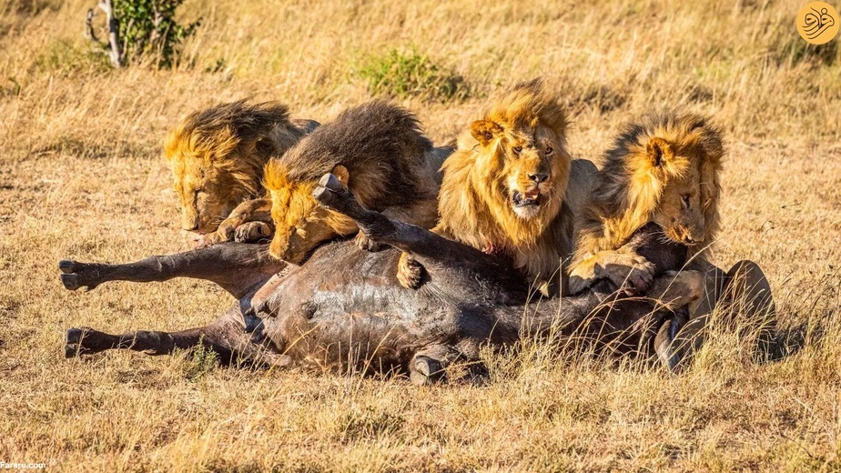 (تصاویر) اتفاقی کمسابقه در حیات وحش؛ چهار شیر نر یک بوفالو را کشتند