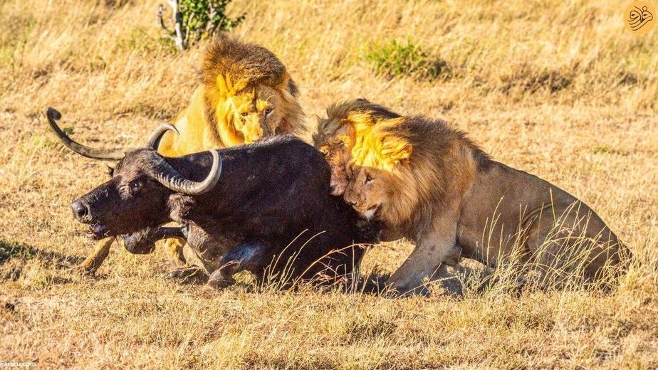 ائتلافی از شیرهای نر موفق به شکار یک بوفالوی جدا شده از گله بوفالوها شدند.