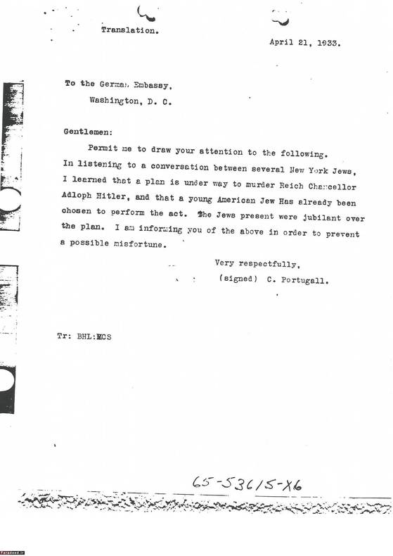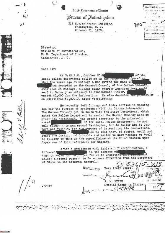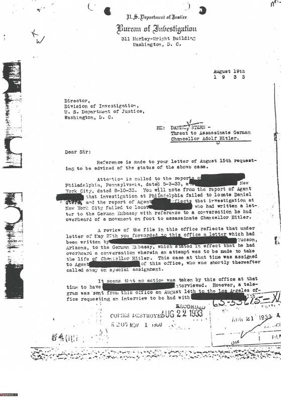 سپس گفته شد که احتمالا یک روانی چنین نامهای را نوشته باشد! آنها از دفتر نیویورک خواستند تا نام او را در تمام دفاتر جستجو کنند، اما همه جا به در بسته میخوردند. در این حین، بخش جنایی در تاریخ 28 مه نامهای از سفارت آلمان دریافت کرد. نویسندهای که نامش در اسناد FBI پاک شده بود، گفته بود که «از دو یهودی شنیده که هیتلر قرار است بین ماه مه و سپتامبر سال 1933 میلادی توسط یکی از یهودیان نیویورک ترور شود. قرار است به هیتلر سم خورانده شود و یا تیراندازی شود و یک جوان یهودی این کار را انجام خواهد داد.»