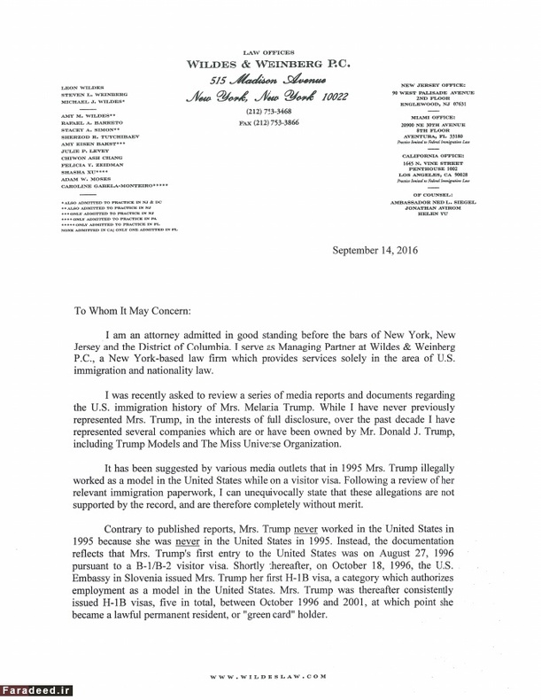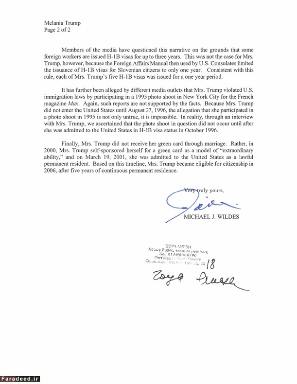نامه مربوط به فرآیند مهاجرت ملانیا ترامپ