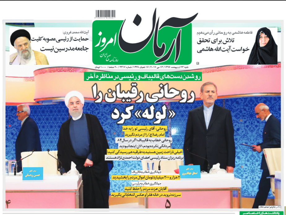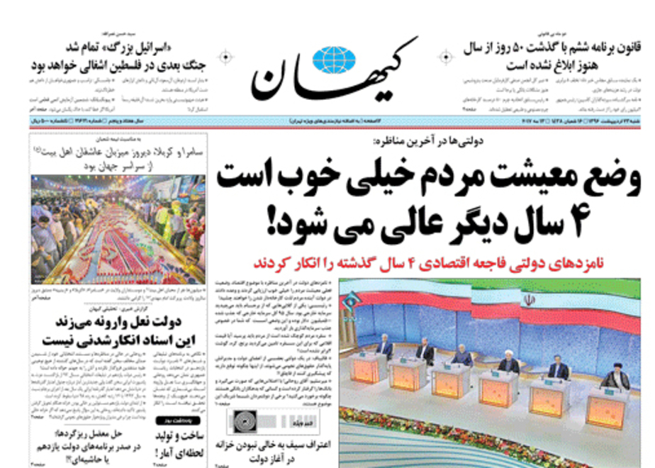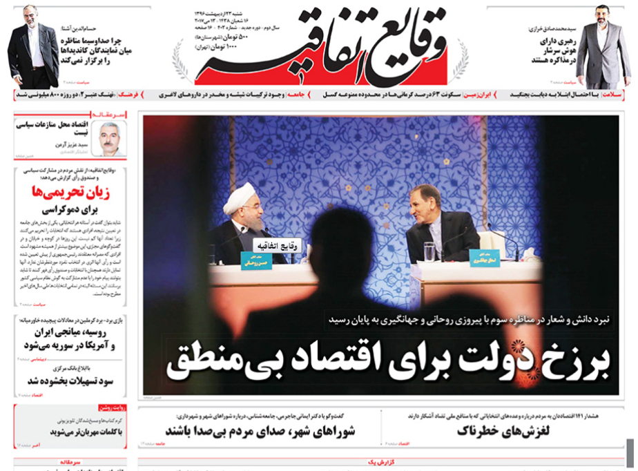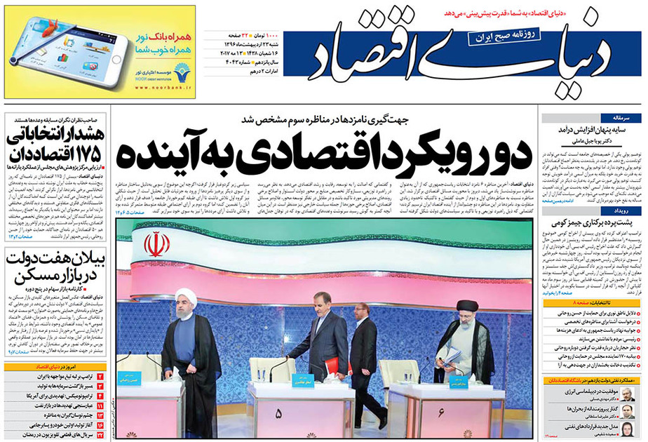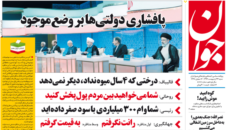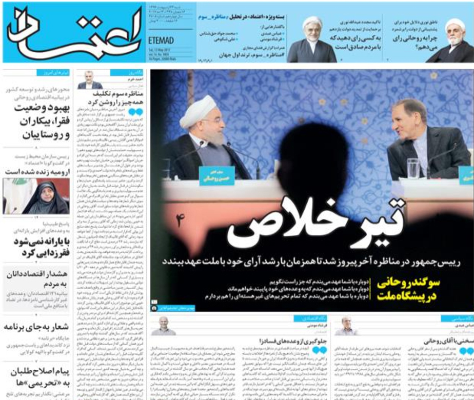 روزنامه های امروز برگزاری آخرین مناظره سوم در موضوع اقتصادی را در کانون توجه قرار داده است. این در حالی است که روزنامه ها با گزاریش های مختلف سعی کردند که انامزد مورد نظر خود را پیروز مناظره جلوه دهند و هر کدان نیز برای این ادعای خود دلایلی آورده اند.