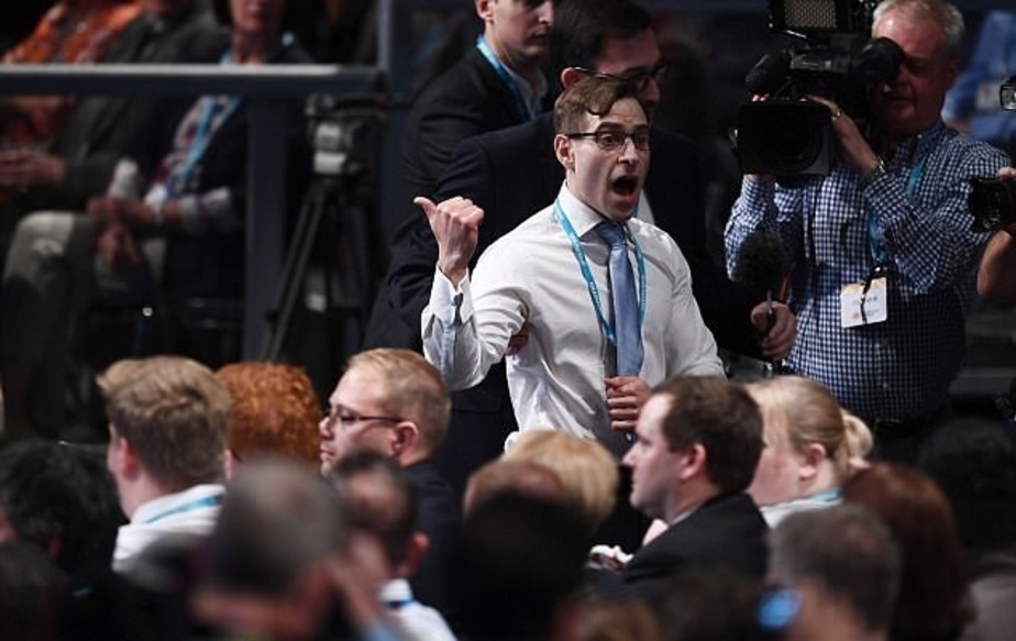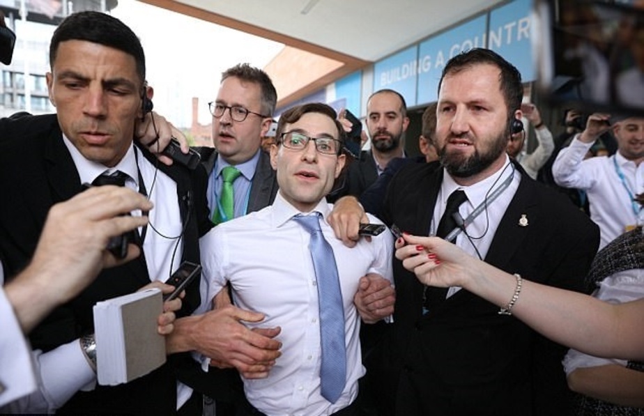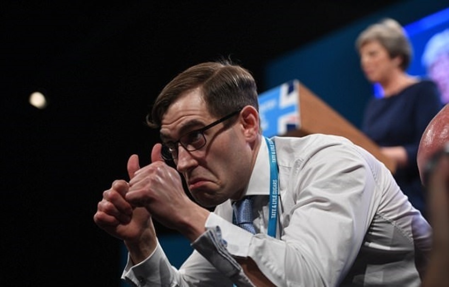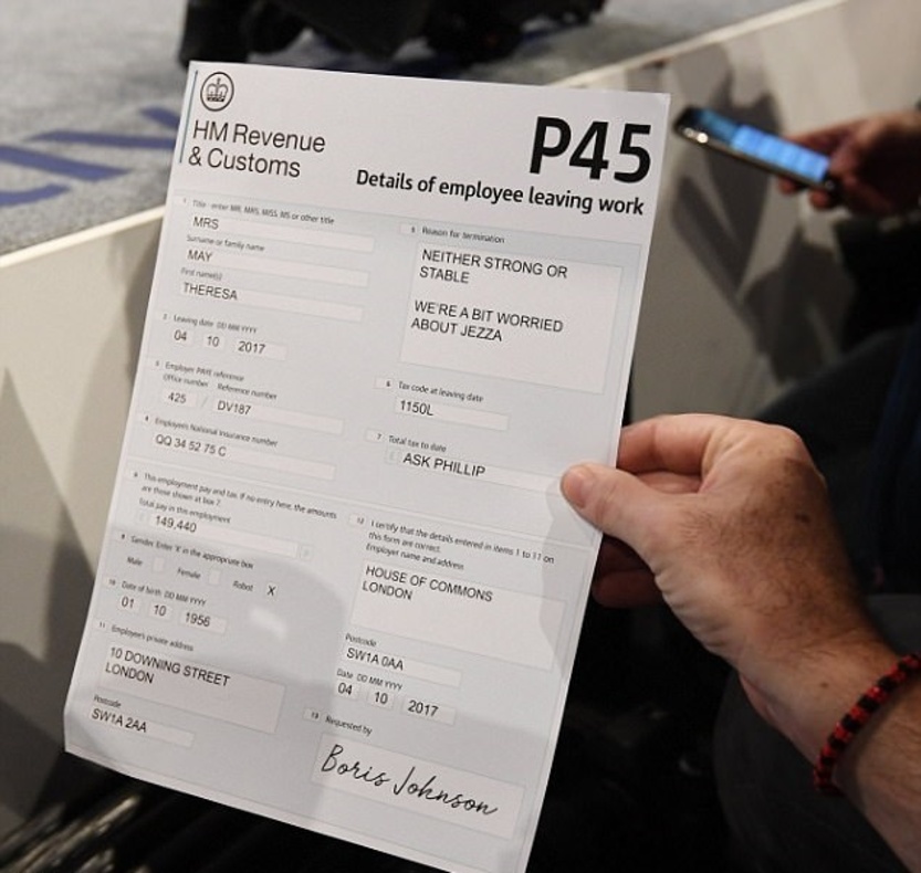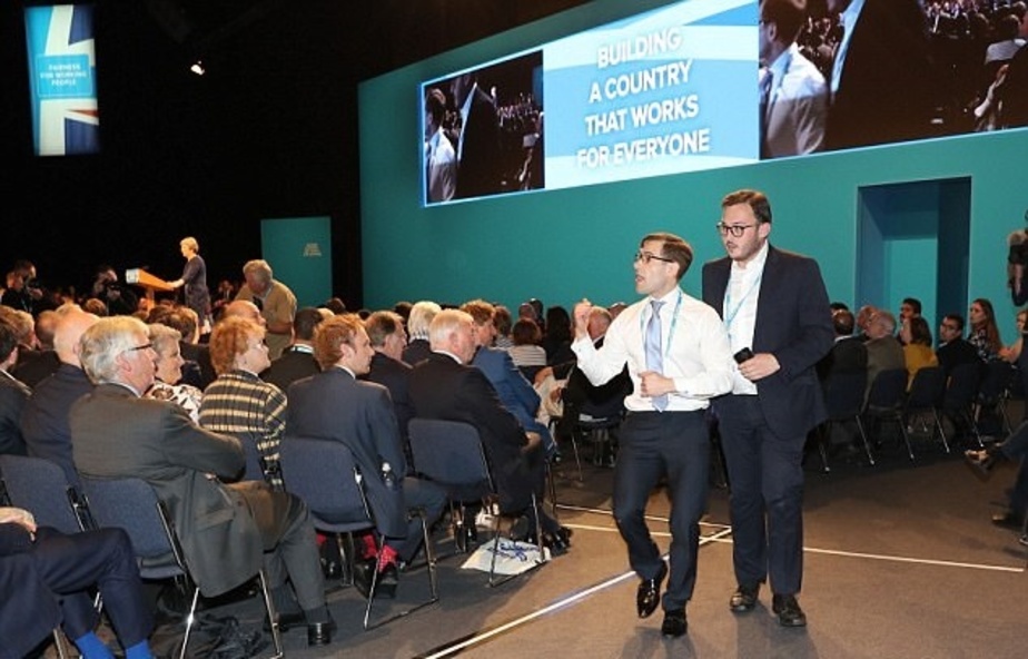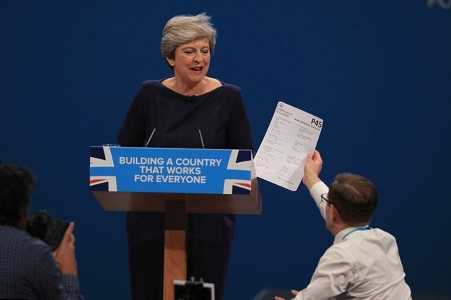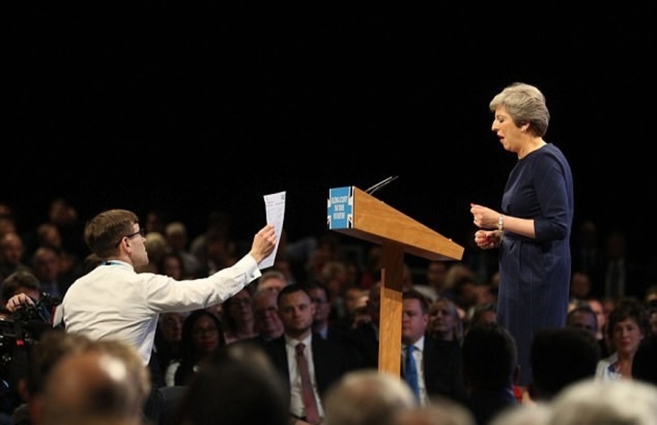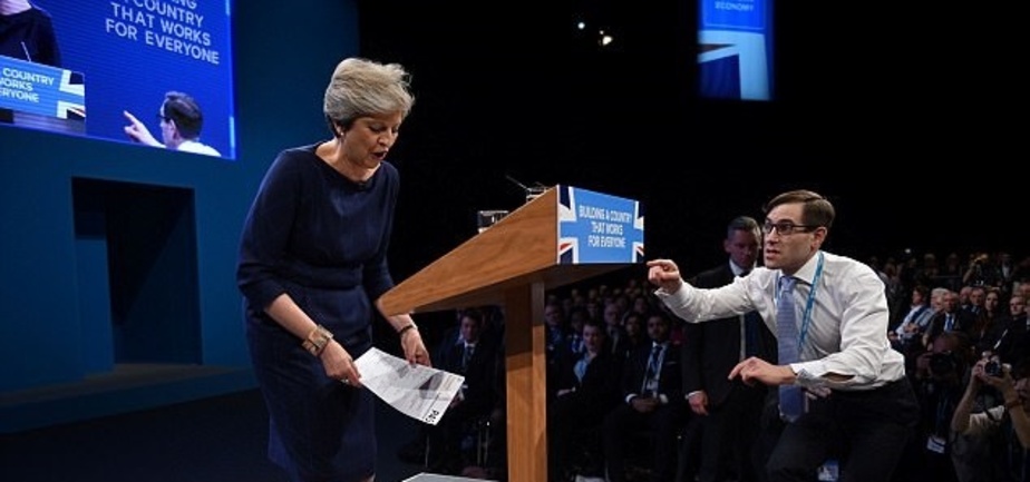 در آخرین روز از کنفرانس سالانه حزب محافظهکار، فردی معترض با قصد برهم زدن نظم برنامه، کاغذی را در مقابل دوربین خبرنگاران به «ترزا می» داد که در آن حکم پایان کار نخستوزیر توسط وزیر خارجهاش امضاء شده بود.