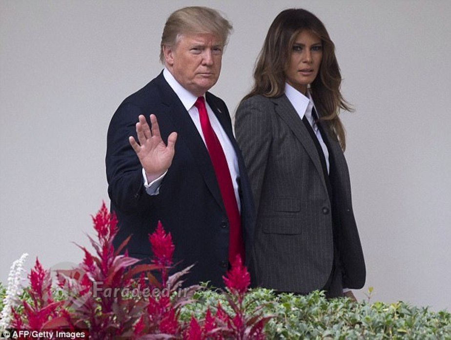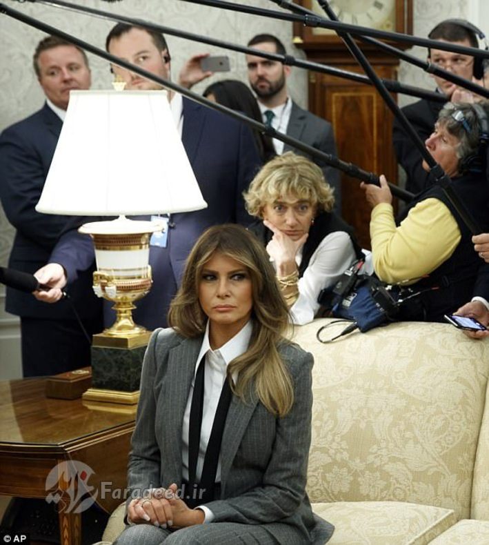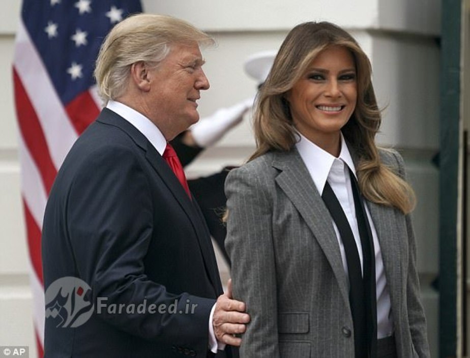 فرادید | در جریان نشستی که دونالد ترامپ و ملانیا ترامپ، میزبان جاستین ترودو و همسرش، سوفی در کاخ سفید بودند، ملانیا یک کت و شلوار راه راه خاکستری پوشیده و یک کراوات گره نزده به دور گردنش انداخته بود.