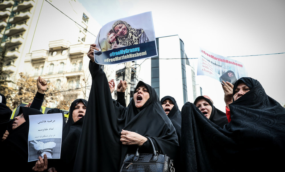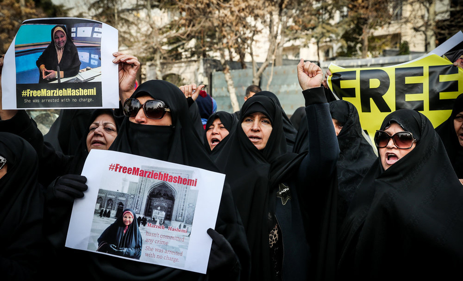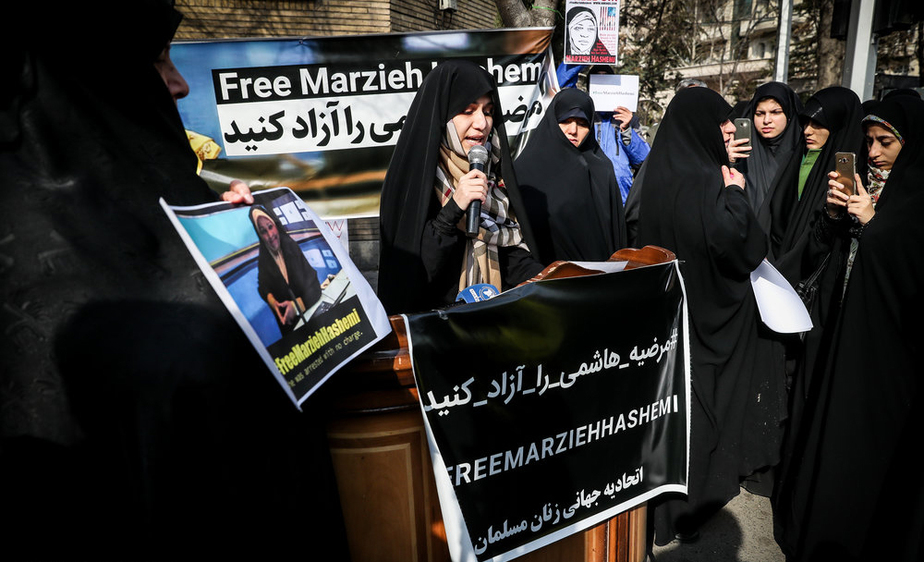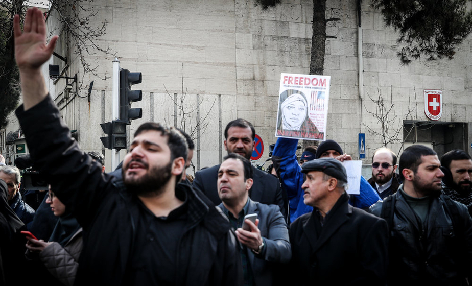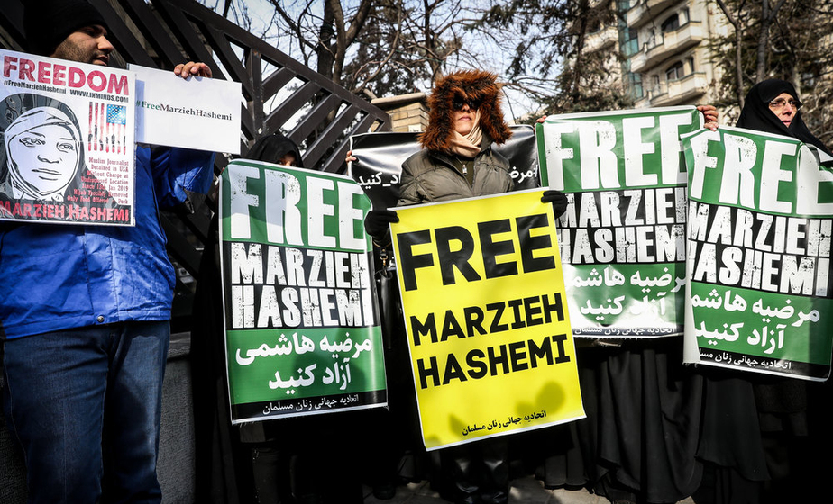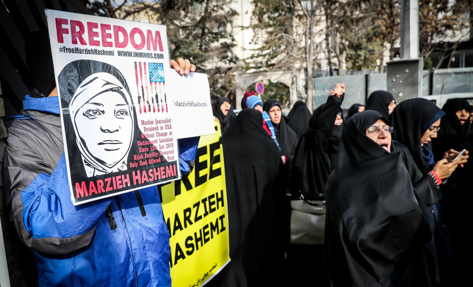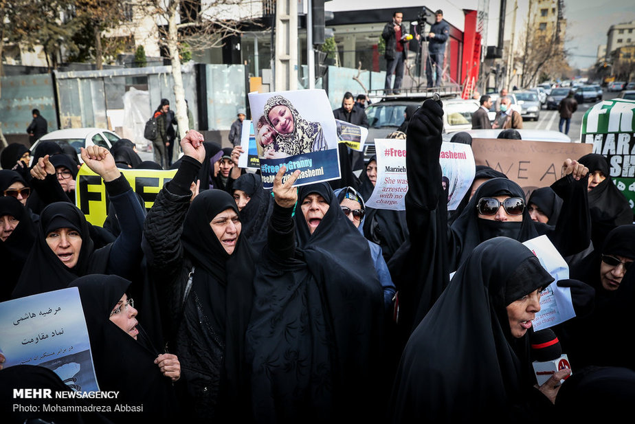 تجمعی در حمایت از «مرضیه هاشمی» خبرنگار آمریکایی الاصل پرس تی وی که توسط آمریکا بازداشت شده است، در مقابل سفارت سوئیس (دفتر حفظ منافع امریکا) تجمع کردند: