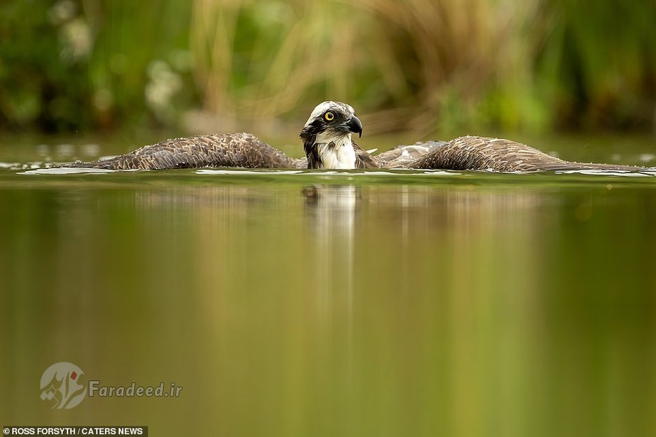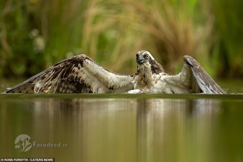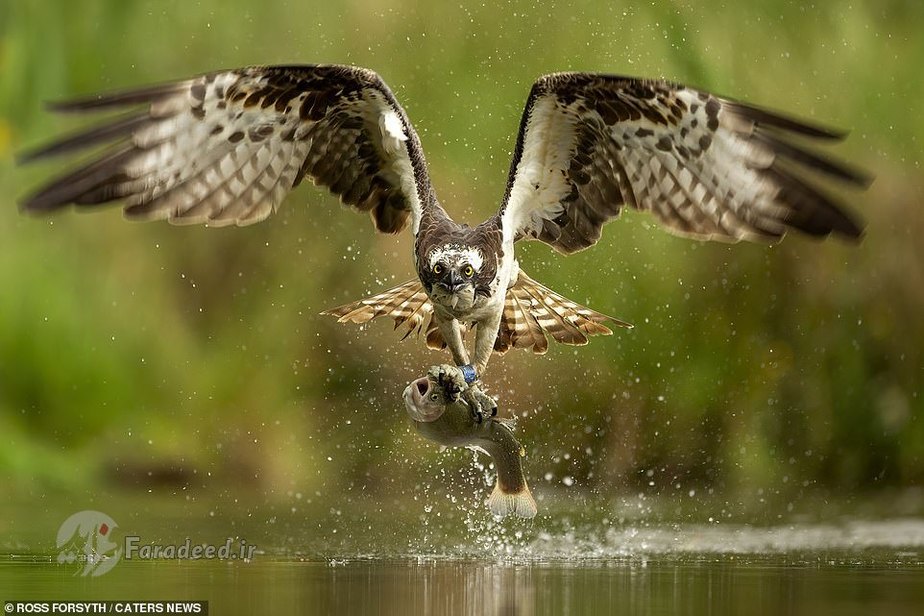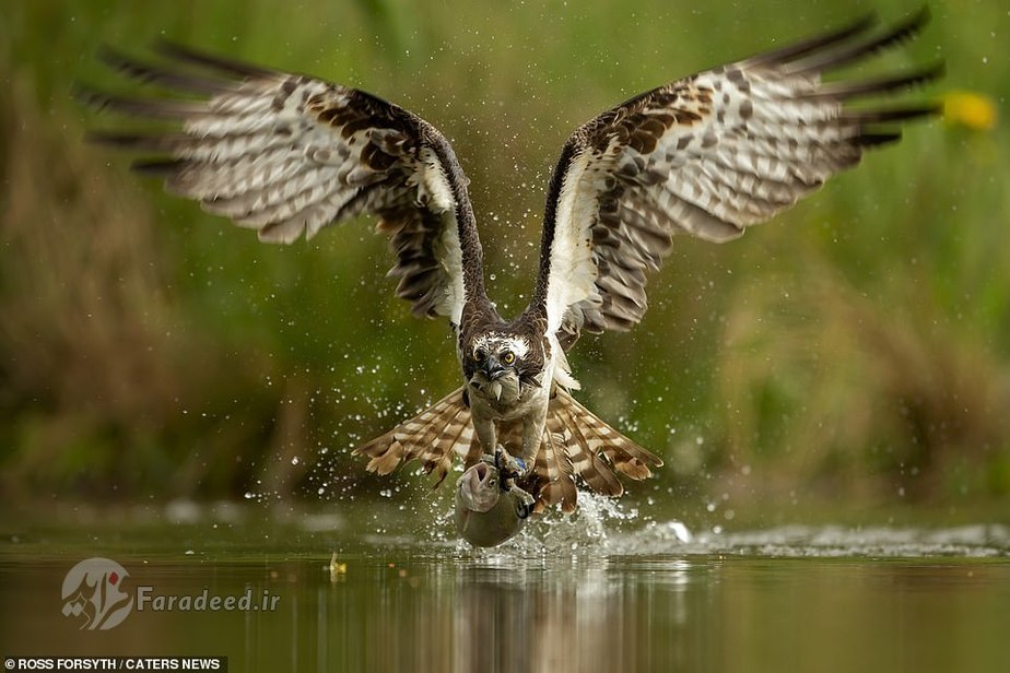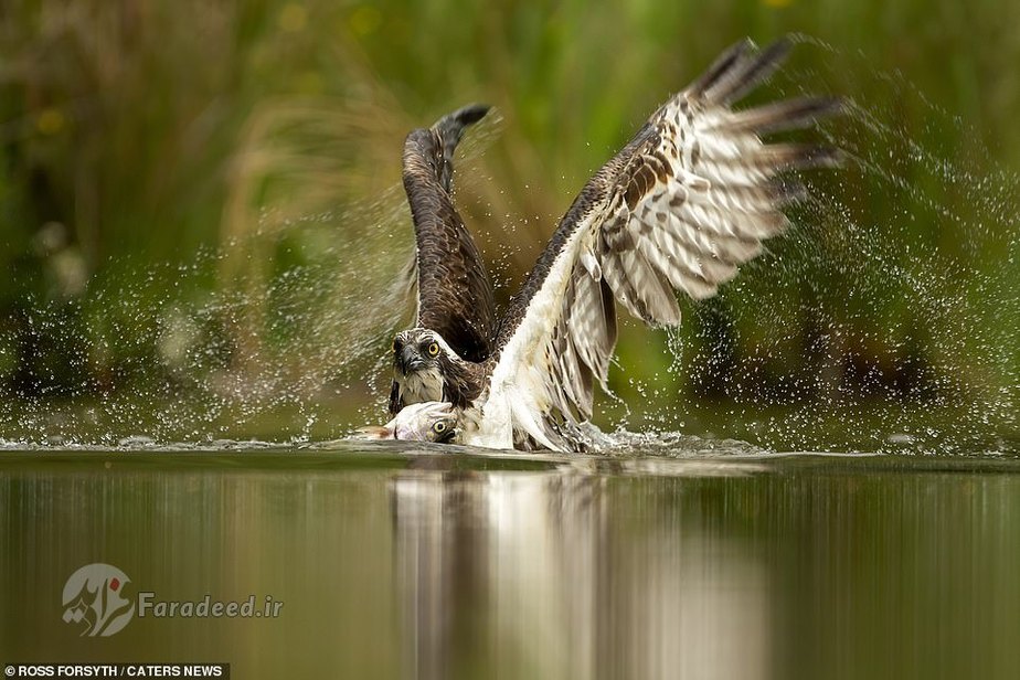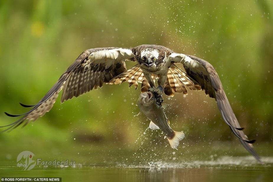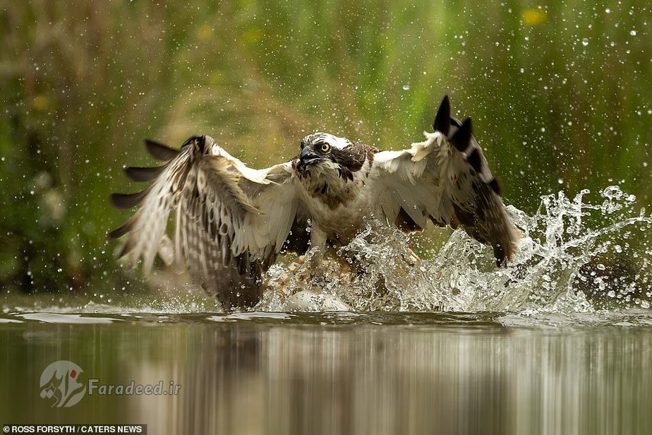 فرادید | این تصاویر خارقالعاده لحظاتی را نشان میدهد که یک همای ماهیخوار (نوعی عقاب دریایی) به داخل آب شیرجه میزند و یک ماهی تازه را شکار میکند و سپس از محل دور میشود تا از غذایش لذت ببرد.