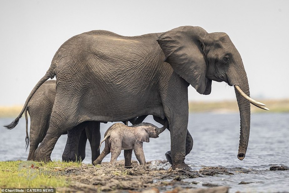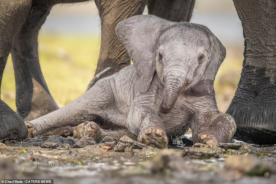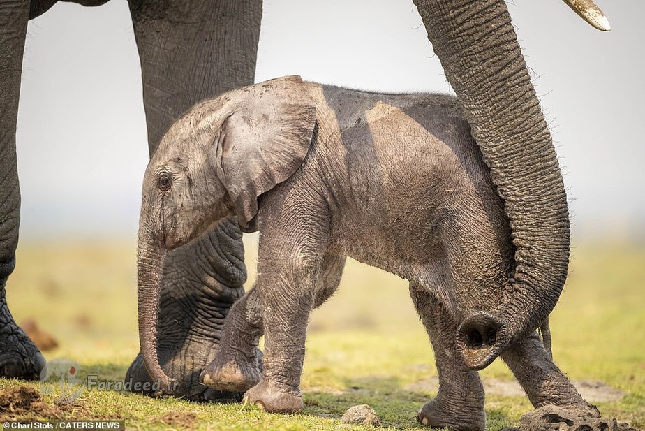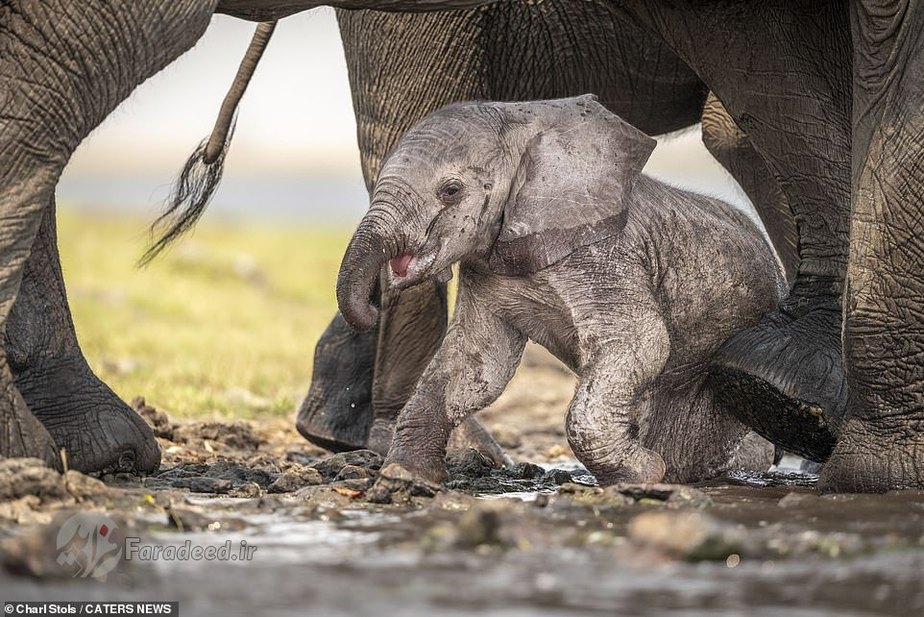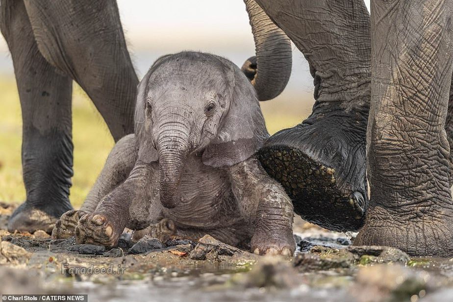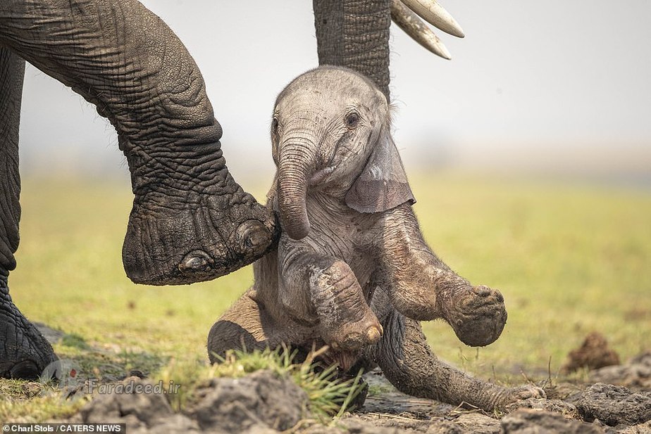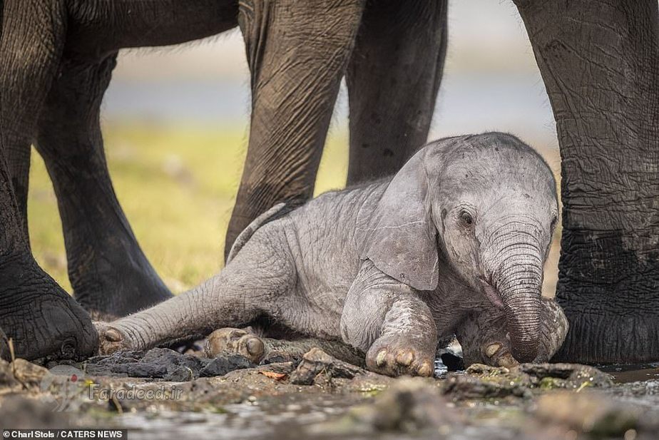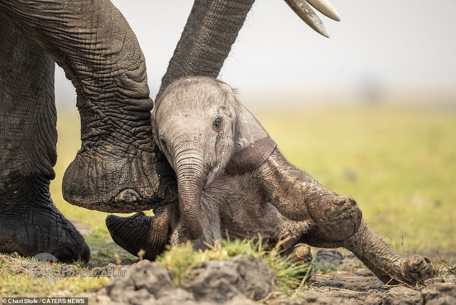فرادید | تصاویر یک فیل مادر درحالی ثبت شده که او دارد به فرزند تازهمتولدشدهاش که بعد از نخستین قدمهای لرزان روی زمین افتاده کمک میکند تا دوباره روی پا بایستد.