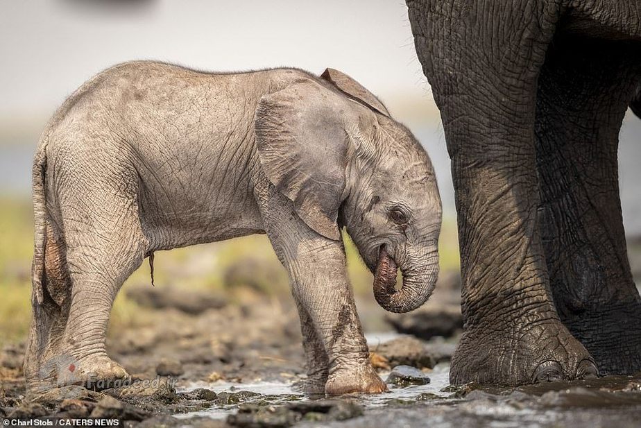 چارل، عکاس ۳۹سالهای که برای یک سافاری کار میکند شاهد این صحنه بود و از آن عکس گرفت. چارل میگوید: «این خانواده فیل داشتند برای آب خوردن به سمت رودخانه میرفتند که کوچکترین فرزند که فقط چند ساعت از تولدش گذشته بود و رنگ پوستش هنوز صورتی بود و پاهایش میلرزیدند، زمین خورد.»