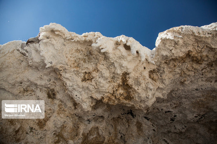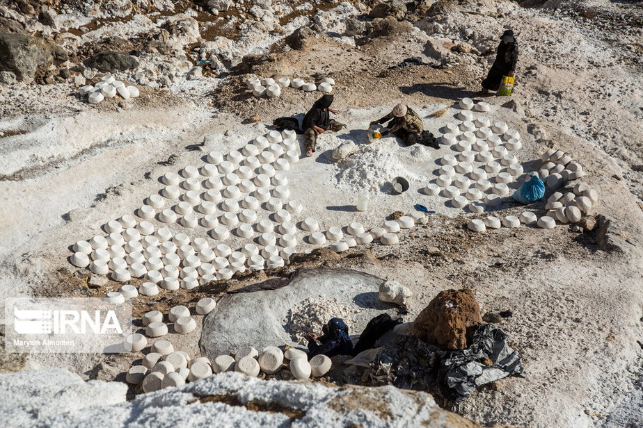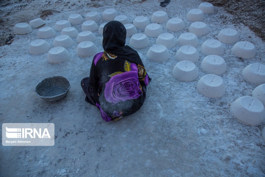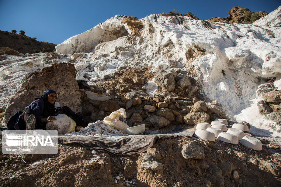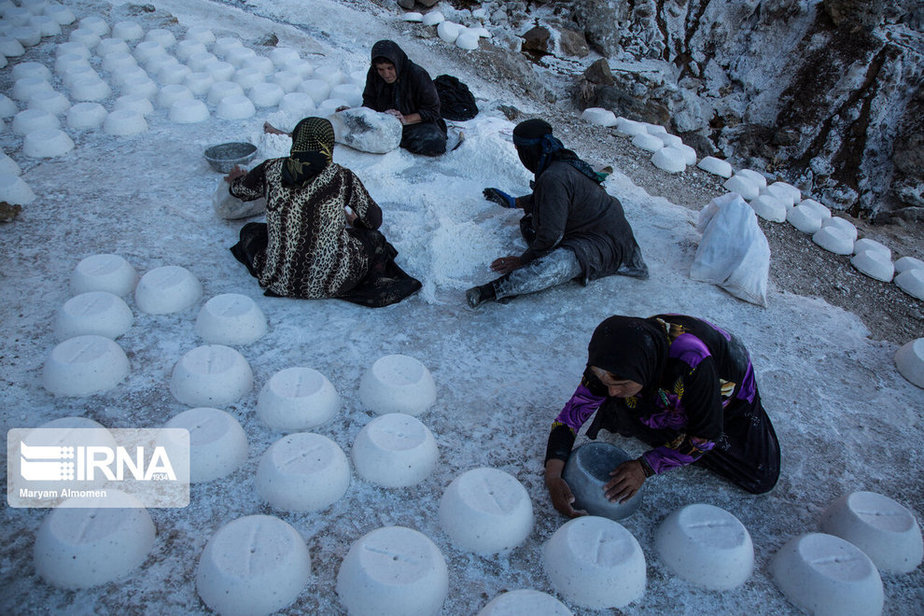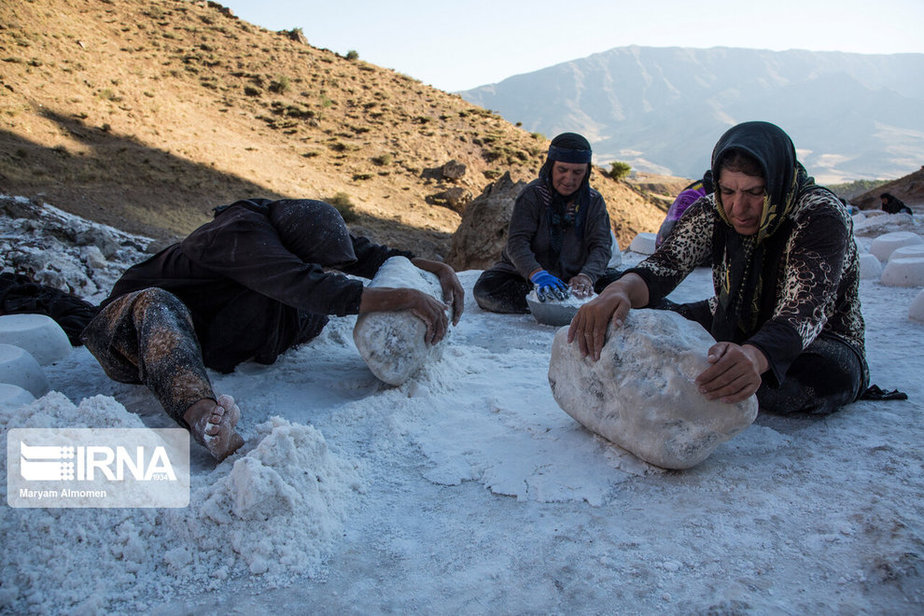 زنان با تیشه به قسمتهای مختلف میروند تا تکههای نمک را جدا کنند؛ تکههای جدا شده به پایین آورده تا با سنگهای بزرگ نرم و آسیاب شود.