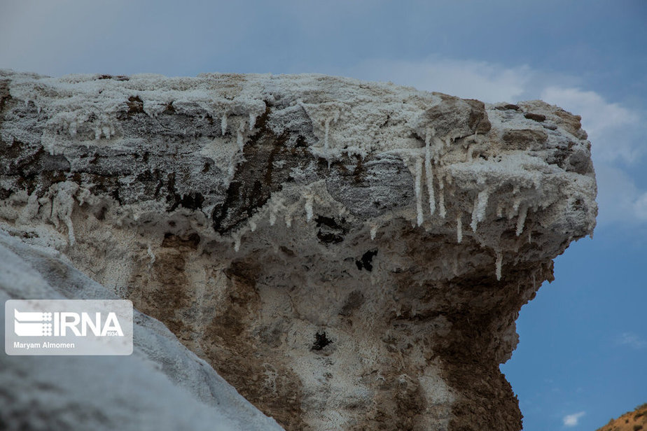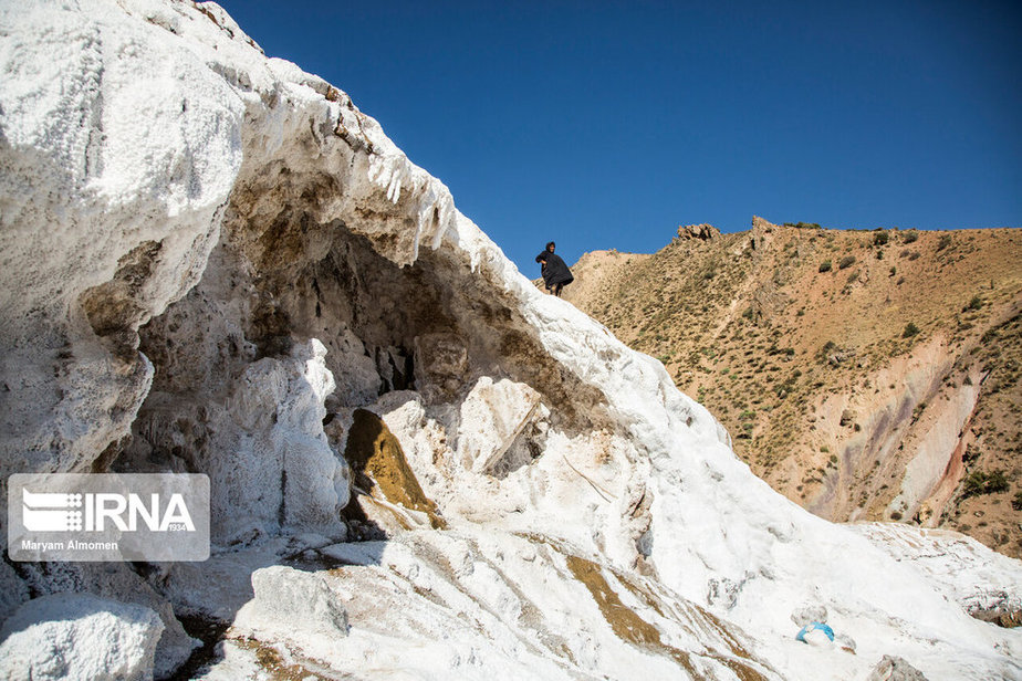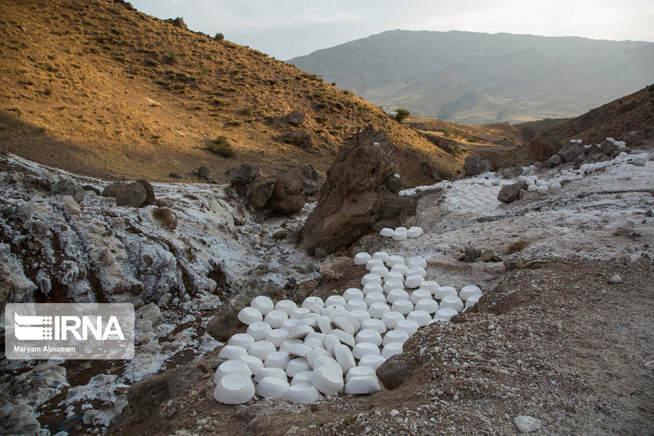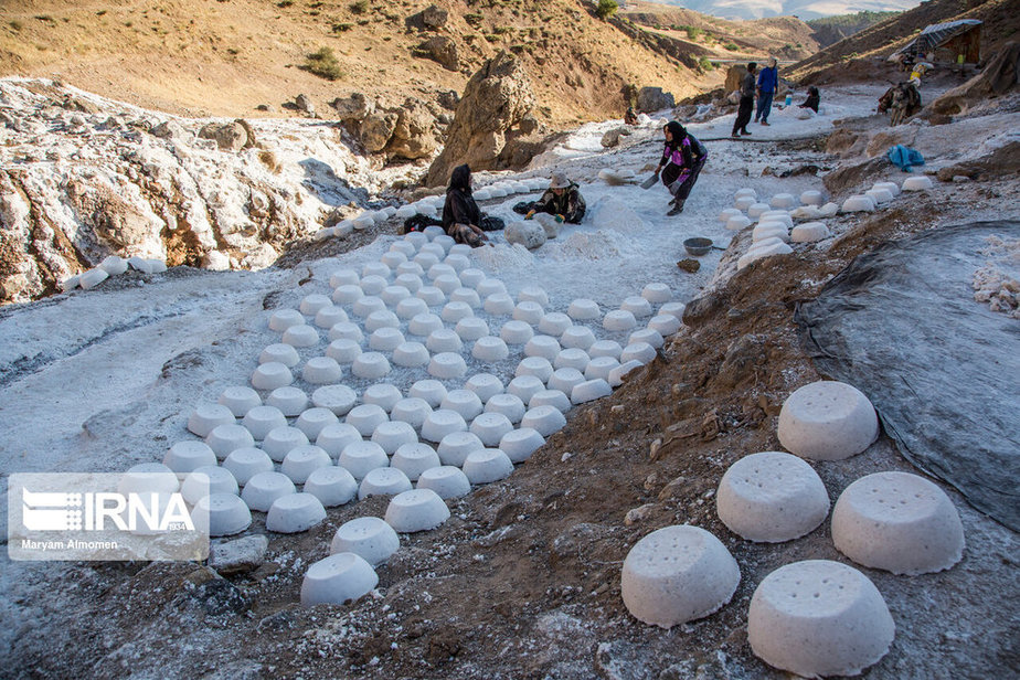 از اواخر فروردین آب چشمه نمکی به روی صخرهها هدایت میشود؛ بعد از گذشت چند روز آب خشک شده و بلورهای نمک نمایان میشود. زنان با تیشه به قسمتهای مختلف میروند تا تکههای نمک را جدا کنند؛ تکههای جدا شده به پایین آورده تا با سنگهای بزرگ نرم و آسیاب شود.