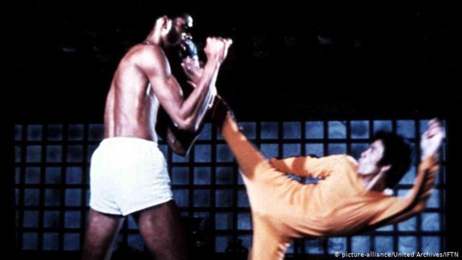 بروس لی در فیلم "اژدها وارد میشود" که اولین و همزمان آخرین فیلم او در هالیوود است