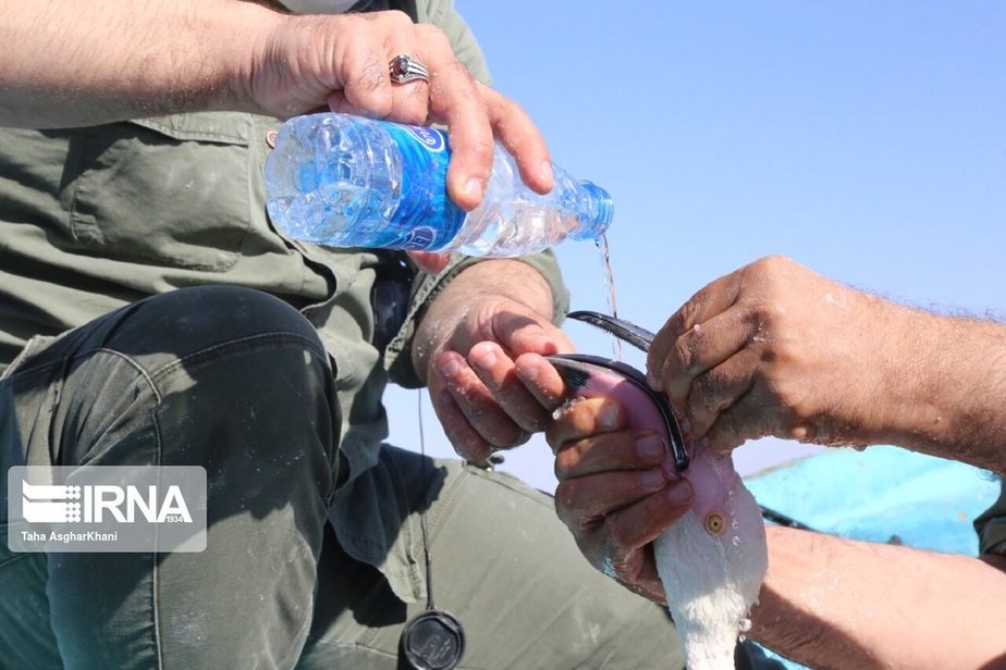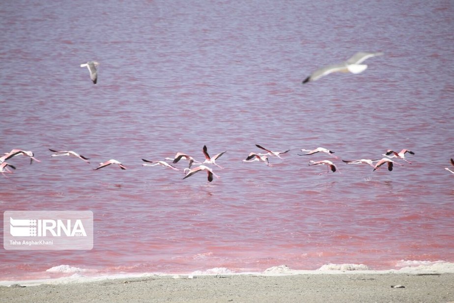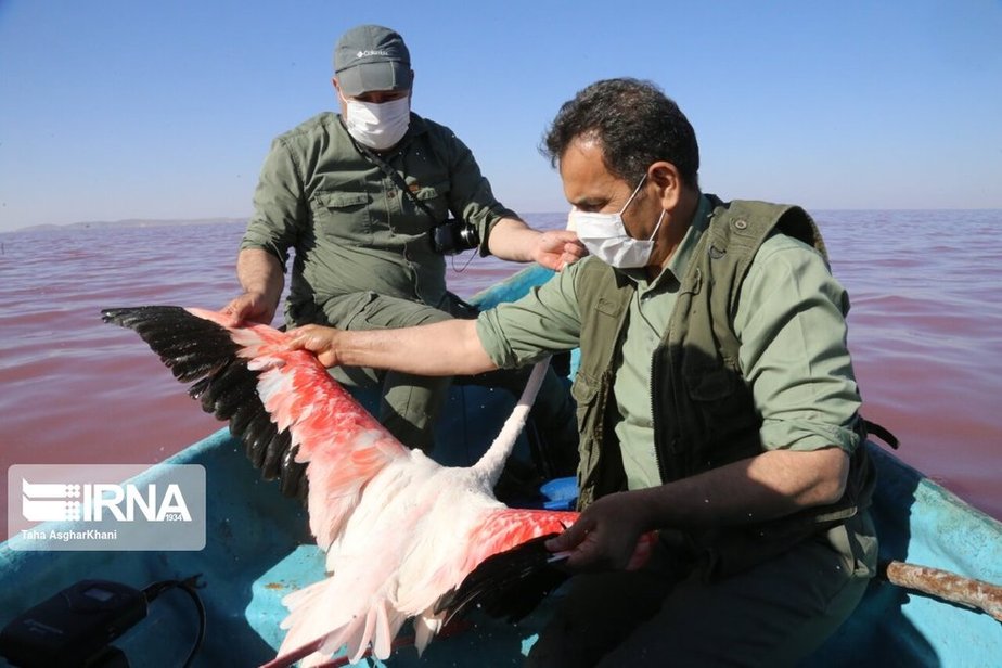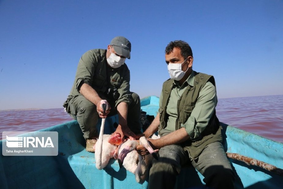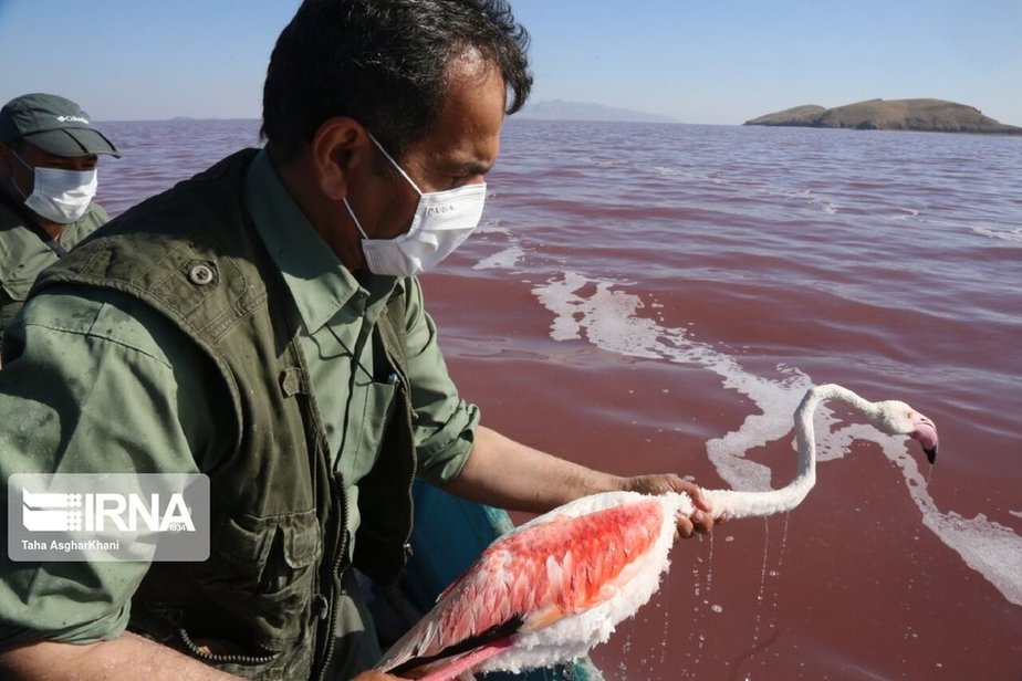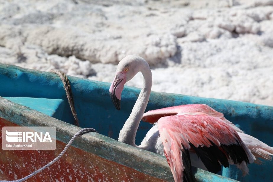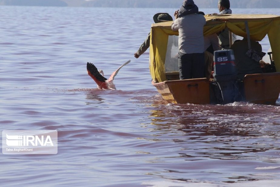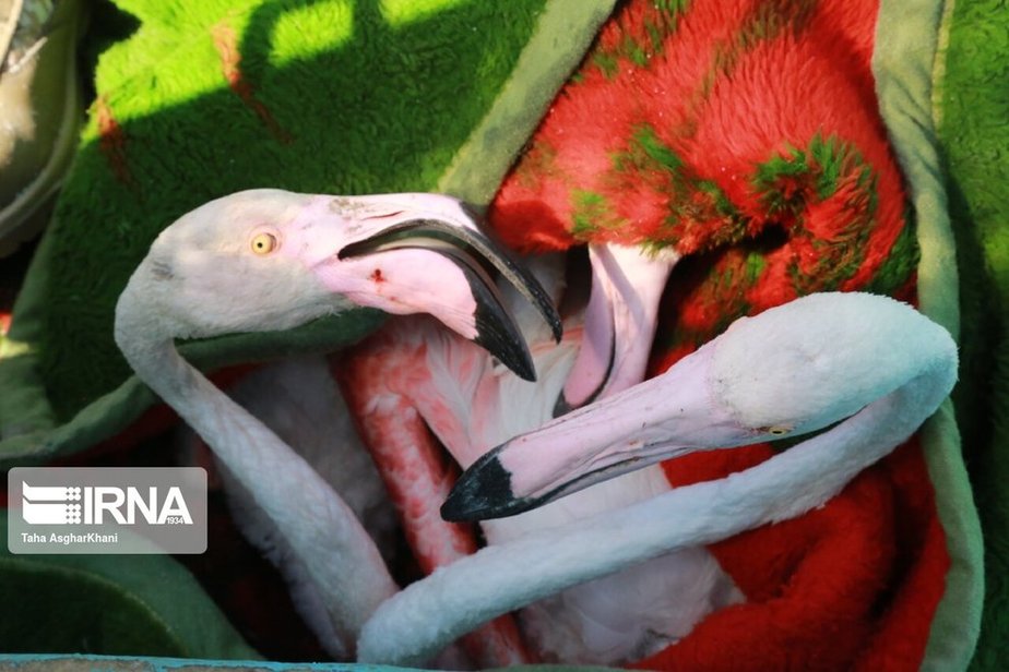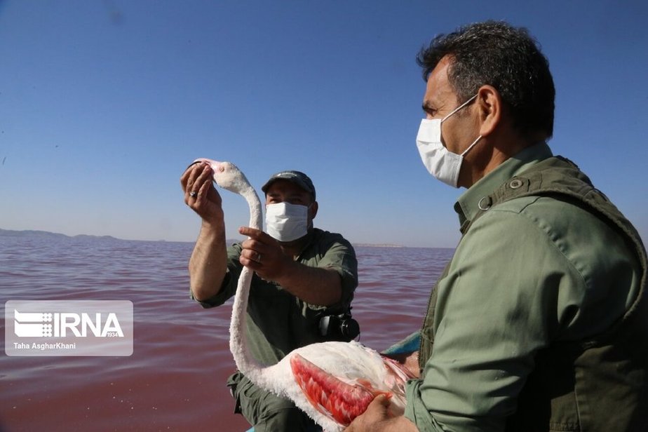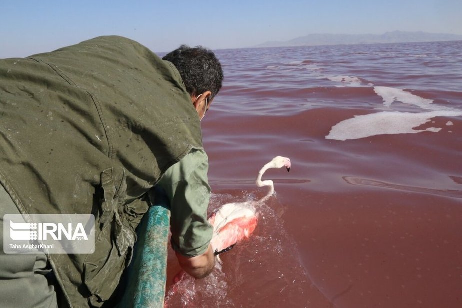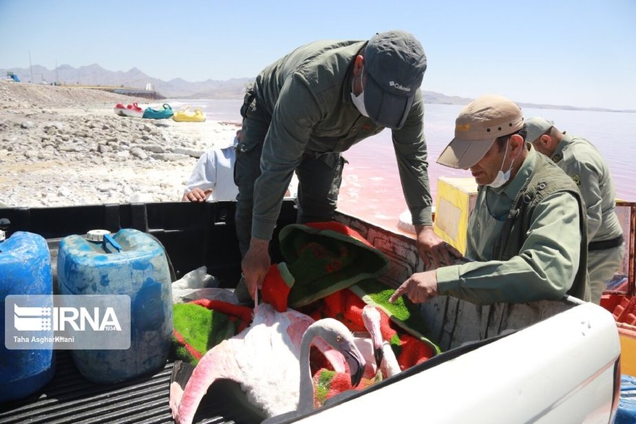 چند فلامینگو که بر اثر تبخیر آب و افزایش غلظت نمک دریاچه ارومیه بال هایشان با بلورهای نمک به هم چسبیده بود و توانایی حرکت نداشتند؛ توسط محیط بانان دریاچه ارومیه نجات یافتند.