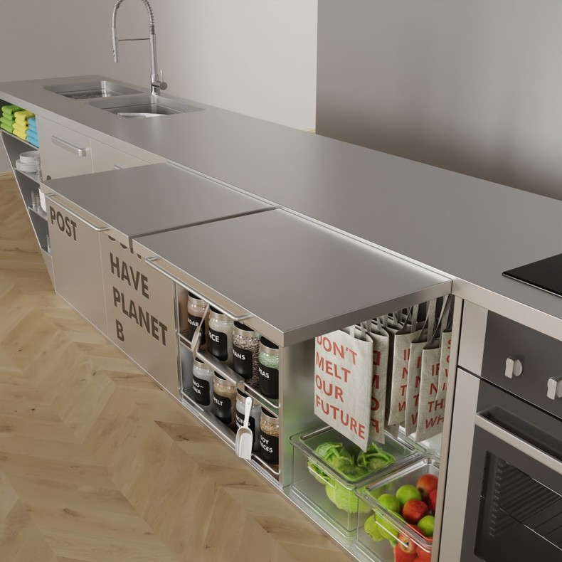 آشپزخانه بدون زباله به عنوان فضایی چند منظوره طراحی شده و شامل یک پیشخوان بزرگ می‌شود که به عنوان میز نیز قابل استفاده است.
