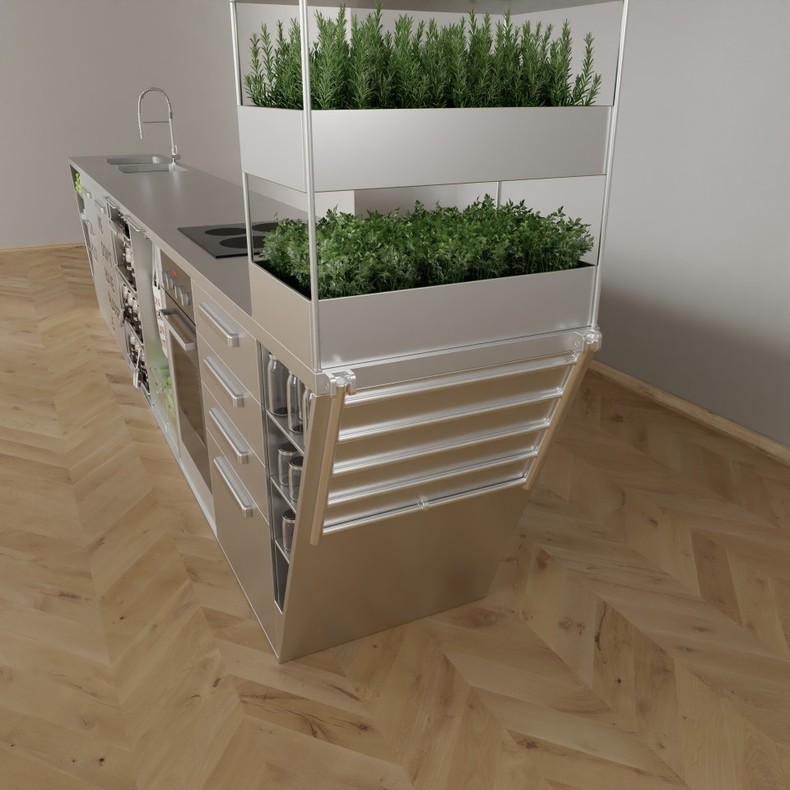 باغ عمودی این آشپزخانه دارای لامپ نور روز برای رشد گیاهان است و می‌توان گیاخاک تولید شده در جعبه کمپوست را در این قسمت استفاده کرد. افزون بر این، آشپزخانه به گونه‌ای طراحی شده تا در مرکز اتاق قرار گرفته و با دیوار‌ها محصور نشود که جنبه‌ای اجتماعی به فضا می‌بخشد.