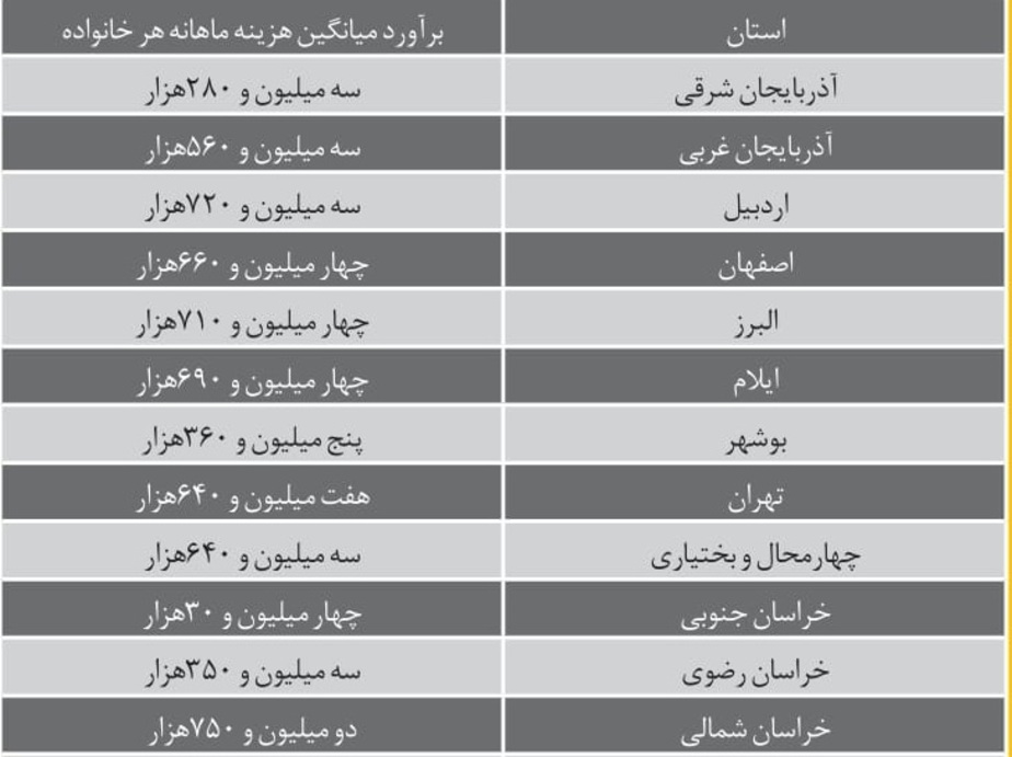 هنوز تمام نشده. این رقم چهار میلیون و ۷۰۰ هزار تومان، میانگین هزینههای خانوارهای کل کشور است. طبیعتا یک خانواده دو نفره خیلی کمتر از یک خانواده ۱۰نفره هزینه دارد.